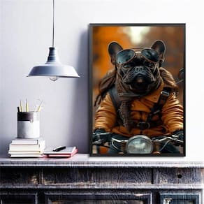 Quadro bulldog francês motociclista 45x34cm Moldura: madeira preta Informações do produto tire todas as suas dúvidas no descritivo abaixo: decoração para quarto, sala, cozinha, escritório, área gourmet e muito mais. Chega de paredes vazias. Medidas - cada peça tem 45x34cm a3 . Material do papel - papel fotográfico brilhante de altíssima resolução acabamento - todos os quadros são acompanhados de uma película de acetato para proteção da imagem. - os quadros são embalados de forma segura com plástico bolha com camada dupla de acordo com o tamanho dos quadros. - de 3 meses. Meu quadro chegou. Como posso fixá-lo Você precisa apenas de um martelo e um prego, pois os quadros já vão acompanhados de penduradores. Esta é a forma mais indicada. Caso prefira, você pode utilizar uma fita dupla face neste caso, sugerimos de alta qualidade para evitar que descole e seu quadro caia . Como posso limpar meu quadro A limpeza é feita como um móvel comum da sua casa. Apenas um pano seco ou espanador são suficientes para tal Marca: Não Informado Ean: 7893653974599