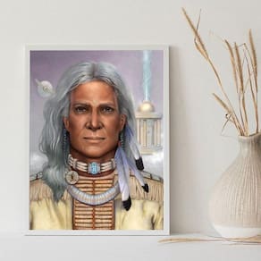O Quadro Caboclo Pena Branca é produzido com papel fotográfico brilhante de altíssima resolução, o que proporciona uma imagem nítida e de qualidade. Sua moldura é em madeira maciça na cor preta, o que confere ainda mais estilo ao produto.