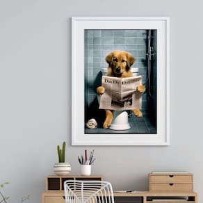 Quadro cachorrinho no banheiro - 60x48cm Moldura: madeira preta Informações do produto tire todas as suas dúvidas no descritivo abaixo: decoração para quarto, sala, cozinha, escritório, área gourmet e muito mais. Chega de paredes vazias medidas - cada peça tem 60x48cm . Material do papel - papel fotográfico brilhante de altíssima resolução acabamento - todos os quadros são acompanhados de vidro para proteção da imagem. - moldura em madeira maciça na cor preta ou branca conforme produto escolhido e pendurador. - paspatur branco com 7cm de largura - os quadros são embalados de forma segura com plástico bolha com camada dupla de acordo com o tamanho dos quadros. Garantia - garantia de 3 meses. Meu quadro chegou. Como posso fixá-lo Você precisa apenas de um martelo e um prego, pois os quadros já vão acompanhados de penduradores. Esta é a forma mais indicada. Como posso limpar meu quadro A limpeza é feita como um móvel comum da sua casa. Apenas um pano seco ou espanador são suficientes para tal