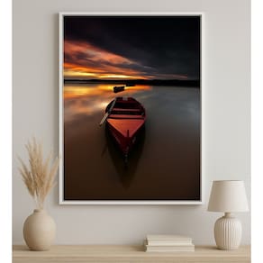 Quadro Canvas Barco Vermelho Ao Por Sol 90x60cm Mold Preta