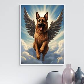 Quadro cão pastor alemão com asas 45x34cm - com vidro Moldura: madeira preta Informações do produto tire todas as suas dúvidas no descritivo abaixo: decoração para quarto, sala, cozinha, escritório, área gourmet e muito mais. Chega de paredes vazias medidas - cada peça tem 45x34cm a3 . Material do papel - papel fotográfico brilhante de altíssima resolução acabamento - todos os quadros são acompanhados de vidro para proteção da imagem. - moldura em madeira maciça na cor preta ou branca conforme produto escolhido e pendurador . - os quadros são embalados de forma segura com plástico bolha com camada dupla de acordo com o tamanho dos quadros. Garantia - garantia de 3 meses. Meu quadro chegou. Como posso fixá-lo Você precisa apenas de um martelo e um prego, pois os quadros já vão acompanhados de penduradores. Esta é a forma mais indicada. Como posso limpar meu quadro A limpeza é feita como um móvel comum da sua casa. Apenas um pano seco ou espanador são suficientes para tal