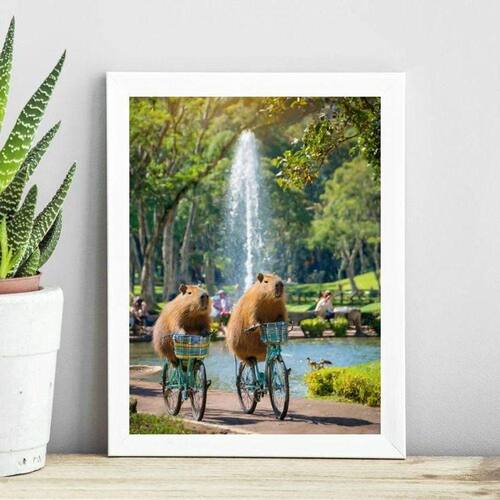 Quadro capivaras andando de bicicleta 24x18cm Moldura: madeira preta Informações do produto tire todas as suas dúvidas no descritivo abaixo: decoração para quarto, sala, cozinha, escritório, área gourmet e muito mais. Chega de paredes vazias medidas - cada peça tem 24x18cm a5 . Material do papel - papel fotográfico brilhante de altíssima resolução acabamento - todos os quadros são acompanhados de uma película de acetato para proteção da imagem. - os quadros são embalados de forma segura com plástico bolha com camada dupla de acordo com o tamanho dos quadros. Garantia - garantia de 3 meses. Meu quadro chegou. Como posso fixá-lo Você precisa apenas de um martelo e um prego, pois os quadros já vão acompanhados de penduradores. Esta é a forma mais indicada. Caso prefira, você pode utilizar uma fita dupla face neste caso, sugerimos de alta qualidade para evitar que descole e seu quadro caia . Como posso limpar meu quadro A limpeza é feita como um móvel comum da sua casa. Apenas um pano seco ou espanador são suficientes para tal