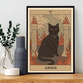 Quadro carta tarot gato signo áries 45x34cm - com vidro Moldura: madeira preta Informações do produto tire todas as suas dúvidas no descritivo abaixo: decoração para quarto, sala, cozinha, escritório, área gourmet e muito mais. Chega de paredes vazias medidas - cada peça tem 45x34cm a3 . Material do papel - papel fotográfico brilhante de altíssima resolução acabamento - todos os quadros são acompanhados de vidro para proteção da imagem. - moldura em madeira maciça na cor preta ou branca conforme produto escolhido e pendurador . - os quadros são embalados de forma segura com plástico bolha com camada dupla de acordo com o tamanho dos quadros. Garantia - garantia de 3 meses. Meu quadro chegou. Como posso fixá-lo Você precisa apenas de um martelo e um prego, pois os quadros já vão acompanhados de penduradores. Esta é a forma mais indicada. Como posso limpar meu quadro A limpeza é feita como um móvel comum da sua casa. Apenas um pano seco ou espanador são suficientes para tal Ean: 7896007409167