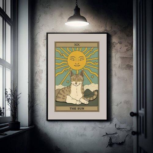 Quadro carta tarot gato the sun - 60x48cm Moldura: madeira branca Informações do produto tire todas as suas dúvidas no descritivo abaixo: decoração para quarto, sala, cozinha, escritório, área gourmet e muito mais. Chega de paredes vazias medidas - cada peça tem 60x48cm . Material do papel - papel fotográfico brilhante de altíssima resolução acabamento - todos os quadros são acompanhados de vidro para proteção da imagem. - moldura em madeira maciça na cor preta ou branca conforme produto escolhido e pendurador. - paspatur branco com 7cm de largura - os quadros são embalados de forma segura com plástico bolha com camada dupla de acordo com o tamanho dos quadros. Garantia - garantia de 3 meses. Meu quadro chegou. Como posso fixá-lo Você precisa apenas de um martelo e um prego, pois os quadros já vão acompanhados de penduradores. Esta é a forma mais indicada. Como posso limpar meu quadro A limpeza é feita como um móvel comum da sua casa. Apenas um pano seco ou espanador são suficientes para tal Ean: 7891080458804