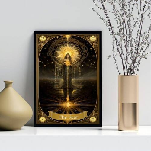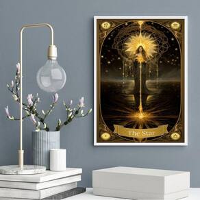 Quadro carta tarot vintage - the star 24x18cm Cor: moldura preta Informações do produto tire todas as suas dúvidas no descritivo abaixo: decoração para quarto, sala, cozinha, escritório, área gourmet e muito mais. Chega de paredes vazias medidas - cada peça tem 24x18cm a5 . Material do papel - papel fotográfico brilhante de altíssima resolução acabamento - todos os quadros são acompanhados de uma película de acetato para proteção da imagem. - os quadros são embalados de forma segura com plástico bolha com camada dupla de acordo com o tamanho dos quadros. Garantia - garantia de 3 meses. Meu quadro chegou. Como posso fixá-lo Você precisa apenas de um martelo e um prego, pois os quadros já vão acompanhados de penduradores. Esta é a forma mais indicada. Caso prefira, você pode utilizar uma fita dupla face neste caso, sugerimos de alta qualidade para evitar que descole e seu quadro caia . Como posso limpar meu quadro A limpeza é feita como um móvel comum da sua casa. Apenas um pano seco ou espanador são suficientes para tal