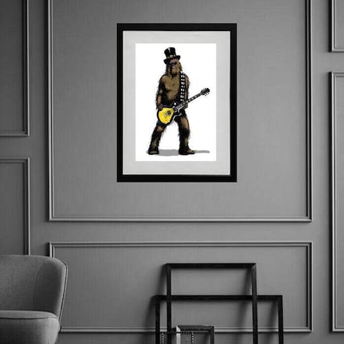 Quadro chewbacca rock - 60x48cm Moldura: madeira preta Informações do produto tire todas as suas dúvidas no descritivo abaixo: decoração para quarto, sala, cozinha, escritório, área gourmet e muito mais. Chega de paredes vazias medidas - cada peça tem 60x48cm . Material do papel - papel fotográfico brilhante de altíssima resolução acabamento - todos os quadros são acompanhados de vidro para proteção da imagem. - moldura em madeira maciça na cor preta ou branca conforme produto escolhido e pendurador. - paspatur branco com 7cm de largura - os quadros são embalados de forma segura com plástico bolha com camada dupla de acordo com o tamanho dos quadros. Garantia - garantia de 3 meses. Meu quadro chegou. Como posso fixá-lo Você precisa apenas de um martelo e um prego, pois os quadros já vão acompanhados de penduradores. Esta é a forma mais indicada. Como posso limpar meu quadro A limpeza é feita como um móvel comum da sua casa. Apenas um pano seco ou espanador são suficientes para tal