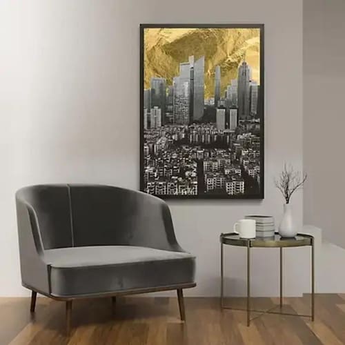 Quadro cidade cinza com céu dourado 24x18cm - com vidro Moldura: madeira preta