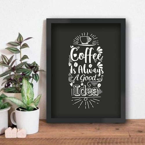 Quadro Coffe Is Always A Good Idea Estrutura Ideias A4 Quadro decorativo Tamanho A4 24x32 cm Fixação: Fitas dupla face para fixar em paredes lisas ou Fixadores convencionais para todo tipo de parede ; Cor da Moldura: Preta; Moldura: Feita em madeira de reflorestamento; Acabamento da moldura: Laqueada, fosca. Fundo: em Mdf; Acompanha Vidro para proteção da imagem; Impresso da arte: Em máxima qualidade em papel couchê premium de alta densidade e gramatura. Marca: Colou Tá Colado Ean: 6012501153196