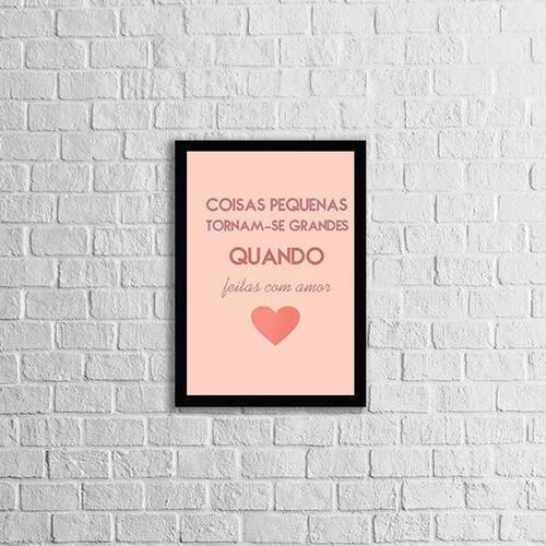 Quadro coisas pequenas feitas com amor 24x18cm Moldura: madeira preta Informações do produto tire todas as suas dúvidas no descritivo abaixo: decoração para quarto, sala, cozinha, escritório, área gourmet e muito mais. Chega de paredes vazias medidas - cada peça tem 24x18cm a5 . Material do papel - papel fotográfico brilhante de altíssima resolução acabamento - todos os quadros são acompanhados de uma película de acetato para proteção da imagem. - moldura em madeira maciça na cor branca e pendurador móvel que pode ser retirado facilmente caso deseje fixar com fita dupla face. - os quadros são embalados de forma segura com plástico bolha com camada dupla de acordo com o tamanho dos quadros. Garantia - garantia de 3 meses prazo de envio pedimos 24 horas úteis no máximo para enviar seu pedido após o envio, segue os prazos normais dos correios, cerca de 7 dias úteis exceto para norte e nordeste, que pode ser de até 14 dias úteis. Em diversas cidades, este prazo normalmente é reduzido, mas depende do prazo dos correios. Meu quadro chegou. Como posso fixá-lo Você precisa apenas de um martelo e um prego, pois os quadros já vão acompanhados de penduradores. Esta é a forma mais indicada. Caso prefira, você pode utilizar uma fita dupla face neste caso, sugerimos de alta qualidade para evitar que descole e seu quadro caia . Como posso limpar meu quadro A limpeza é feita como um móvel comum da sua casa. Apenas um pano seco ou espanador são suficientes para tal