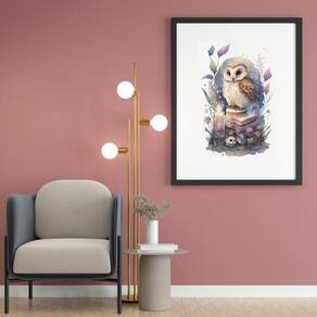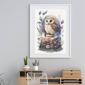 Quadro Coruja Alquimista Aquarela - 60x48cm - Moldura: Madeira branca