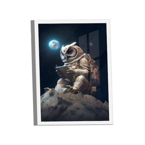Quadro Coruja Espacial -- BR ARTES Moldura Branca e Vidro - Gigante 180x105 -