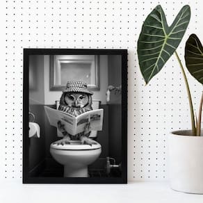 Quadro coruja no banheiro lendo jornal 24x18cm - com vidro Moldura: madeira branca Informações do produto tire todas as suas dúvidas no descritivo abaixo: decoração para quarto, sala, cozinha, escritório, área gourmet e muito mais. Chega de paredes vazias medidas - cada peça tem 24x18cm a5 . Material do papel - papel fotográfico brilhante de altíssima resolução acabamento - todos os quadros são acompanhados de vidro para proteção da imagem. - moldura em madeira maciça na cor preta ou branca conforme produto escolhido e pendurador . - os quadros são embalados de forma segura com plástico bolha com camada dupla de acordo com o tamanho dos quadros. Garantia - garantia de 3 meses. Meu quadro chegou. Como posso fixá-lo Você precisa apenas de um martelo e um prego, pois os quadros já vão acompanhados de penduradores. Esta é a forma mais indicada. Como posso limpar meu quadro A limpeza é feita como um móvel comum da sua casa. Apenas um pano seco ou espanador são suficientes para tal Ean: 7899293597785
