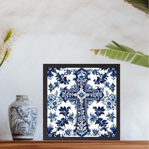 Quadro cruz estilo azulejo português azul e branco - 33x33cm - com vidro Cor: moldura preta Informações do produto tire todas as suas dúvidas no descritivo abaixo: decoração para quarto, sala, cozinha, escritório, área gourmet e muito mais. Chega de paredes vazias medidas - cada peça tem 33x33cm. Material do papel - papel fotográfico brilhante de altíssima resolução acabamento - todos os quadros são acompanhados de vidro para proteção da imagem. - moldura em madeira maciça na cor preta ou branca conforme produto escolhido e pendurador . - os quadros são embalados de forma segura com plástico bolha com camada dupla de acordo com o tamanho dos quadros. - de 3 meses. Meu quadro chegou. Como posso fixá-lo Você precisa apenas de um martelo e um prego, pois os quadros já vão acompanhados de penduradores. Esta é a forma mais indicada. Como posso limpar meu quadro A limpeza é feita como um móvel comum da sua casa. Apenas um pano seco ou espanador são suficientes para tal