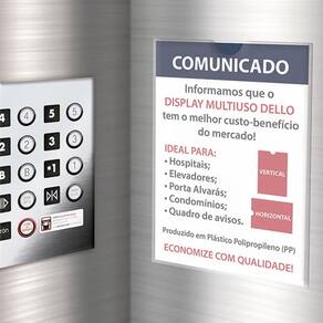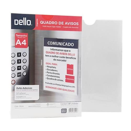 Quadro De Aviso Expositor Multiuso A4 Cristal - Dello DelloQuadro de Avisos A4 Dello Cristal 0534.HContém: 1 unidadeDimensões: 300mm x 210mmm x 5mmEspessura: 0,40 Quadro de avisos em polipropileno auto-adesivo. Ideal para ser fixado em hospitais, elevadores, porta alvarás, condomínios, quadro de avisos entre outros lugares.