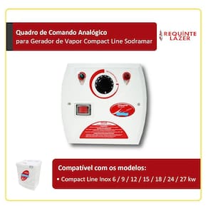 Compatível com o Gerador de Vapor Compact Line Inox Sodramar, acompanha bulbo sensor (que possui a finalidade de registrar a temperatura do ambiente e assim controlá-la automaticamente) e tampa de acabamento para proteção do sensor. O quadro de comando é fabricado em polietileno e deve ser fixado ou concretado na parte externa do cômodo de sauna, numa altura aproximada de 1,60 m.