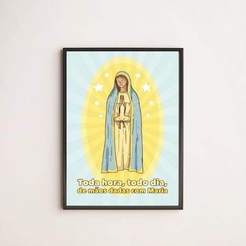 Quadro de mãos dadas com maria 33x24cm - com vidro Moldura: madeira branca Informações do produto tire todas as suas dúvidas no descritivo abaixo: decoração para quarto, sala, cozinha, escritório, área gourmet e muito mais. Chega de paredes vazias medidas - cada peça tem 33x24cm a4 . Material do papel - papel fotográfico brilhante de altíssima resolução acabamento - todos os quadros são acompanhados de vidro para proteção da imagem. - moldura em madeira maciça na cor preta e pendurador . - os quadros são embalados de forma segura com plástico bolha com camada dupla de acordo com o tamanho dos quadros. - de 3 meses. Meu quadro chegou. Como posso fixá-lo Você precisa apenas de um martelo e um prego, pois os quadros já vão acompanhados de penduradores. Esta é a forma mais indicada. Como posso limpar meu quadro A limpeza é feita como um móvel comum da sua casa. Apenas um pano seco ou espanador são suficientes para tal
