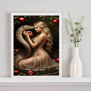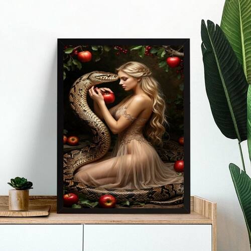 Quadro Decorativo A Tentação - Mulher Maçã Serpente 45x34cm - Cor: Moldura branca