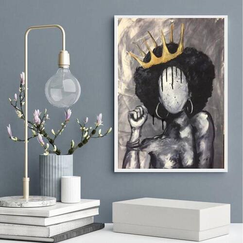 Quadro decorativo abstrato negra com coroa 45x34cm - com vidro Moldura: madeira preta Informações do produto tire todas as suas dúvidas no descritivo abaixo: decoração para quarto, sala, cozinha, escritório, área gourmet e muito mais. Chega de paredes vazias medidas - cada peça tem 45x34cm a3 . Material do papel - papel fotográfico brilhante de altíssima resolução acabamento - todos os quadros são acompanhados de vidro para proteção da imagem. - moldura em madeira maciça na cor preta ou branca conforme produto escolhido e pendurador . - os quadros são embalados de forma segura com plástico bolha com camada dupla de acordo com o tamanho dos quadros. Garantia - garantia de 3 meses. Meu quadro chegou. Como posso fixá-lo Você precisa apenas de um martelo e um prego, pois os quadros já vão acompanhados de penduradores. Esta é a forma mais indicada. Como posso limpar meu quadro A limpeza é feita como um móvel comum da sua casa. Apenas um pano seco ou espanador são suficientes para tal