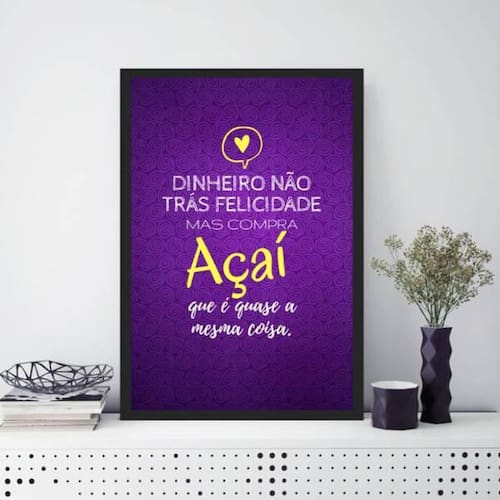 Quadro decorativo açaí felicidade 33x24cm Moldura: madeira preta Informações do produto tire todas as suas dúvidas no descritivo abaixo: decoração para quarto, sala, cozinha, escritório, área gourmet e muito mais. Chega de paredes vazias medidas - cada peça tem 33x24cm a4 . Material do papel - papel fotográfico brilhante de altíssima resolução acabamento - todos os quadros são acompanhados de uma película de acetato para proteção da imagem. - moldura em madeira maciça na cor branca e pendurador móvel que pode ser retirado facilmente caso deseje fixar com fita dupla face. - os quadros são embalados de forma segura com plástico bolha com camada dupla de acordo com o tamanho dos quadros.