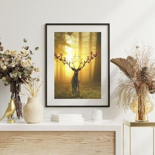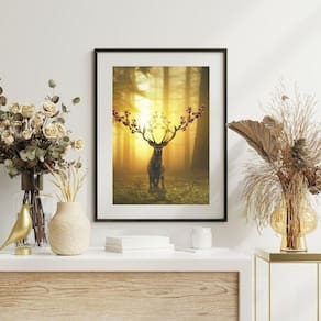 Quadro decorativo alce flores - 60x48cm Moldura: madeira preta Informações do produto tire todas as suas dúvidas no descritivo abaixo: decoração para quarto, sala, cozinha, escritório, área gourmet e muito mais. Chega de paredes vazias medidas - cada peça tem 60x48cm . Material do papel - papel fotográfico brilhante de altíssima resolução acabamento - todos os quadros são acompanhados de vidro para proteção da imagem. - moldura em madeira maciça na cor preta ou branca conforme produto escolhido e pendurador. - paspatur branco com 7cm de largura - os quadros são embalados de forma segura com plástico bolha com camada dupla de acordo com o tamanho dos quadros. Garantia - garantia de 3 meses. Meu quadro chegou. Como posso fixá-lo Você precisa apenas de um martelo e um prego, pois os quadros já vão acompanhados de penduradores. Esta é a forma mais indicada. Como posso limpar meu quadro A limpeza é feita como um móvel comum da sua casa. Apenas um pano seco ou espanador são suficientes para tal
