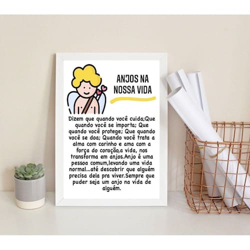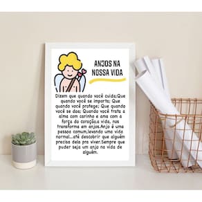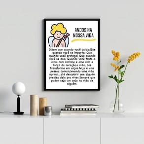 Quadro decorativo anjos na nossa vida 45x34cm - com vidro Moldura: madeira branca Informações do produto tire todas as suas dúvidas no descritivo abaixo: decoração para quarto, sala, cozinha, escritório, área gourmet e muito mais. Chega de paredes vazias medidas - cada peça tem 45x34cm a3 . Material do papel - papel fotográfico brilhante de altíssima resolução acabamento - todos os quadros são acompanhados de vidro para proteção da imagem. - moldura em madeira maciça na cor preta ou branca conforme produto escolhido e pendurador . - os quadros são embalados de forma segura com plástico bolha com camada dupla de acordo com o tamanho dos quadros. Garantia - garantia de 3 meses. Meu quadro chegou. Como posso fixá-lo Você precisa apenas de um martelo e um prego, pois os quadros já vão acompanhados de penduradores. Esta é a forma mais indicada. Como posso limpar meu quadro A limpeza é feita como um móvel comum da sua casa. Apenas um pano seco ou espanador são suficientes para tal Ean: 7895112941166