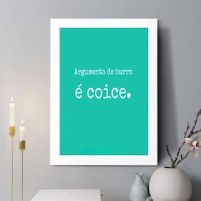 Quadro decorativo argumento de burro é coice 45x34cm Cor: moldura branca Informações do produto tire todas as suas dúvidas no descritivo abaixo: decoração para quarto, sala, cozinha, escritório, área gourmet e muito mais. Chega de paredes vazias. Medidas - cada peça tem 45x34cm a3 . Material do papel - papel fotográfico brilhante de altíssima resolução acabamento - todos os quadros são acompanhados de uma película de acetato para proteção da imagem. - os quadros são embalados de forma segura com plástico bolha com camada dupla de acordo com o tamanho dos quadros. - de 3 meses. Meu quadro chegou. Como posso fixá-lo Você precisa apenas de um martelo e um prego, pois os quadros já vão acompanhados de penduradores. Esta é a forma mais indicada. Caso prefira, você pode utilizar uma fita dupla face neste caso, sugerimos de alta qualidade para evitar que descole e seu quadro caia . Como posso limpar meu quadro A limpeza é feita como um móvel comum da sua casa. Apenas um pano seco ou espanador são suficientes para tal Marca: Não Informado Ean: 7894717355910