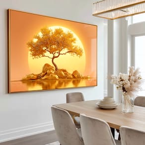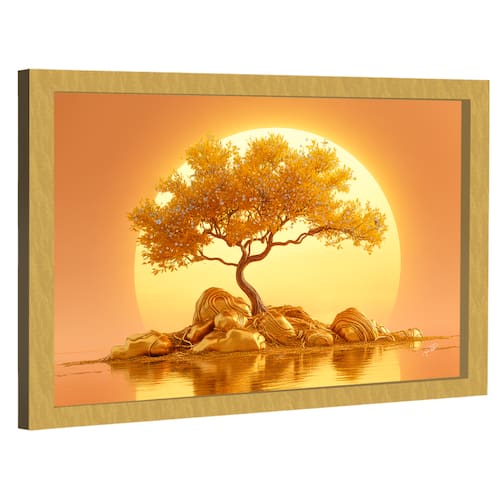 Quadro Decorativo Árvore da Vida Pôr do Sol Moldura Dourada - 84x54cm -