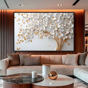 Quadro Decorativo Árvore Elegante Folhas Brancas Moldura Dourada - 118x78cm -