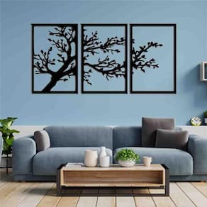 Tamanho total: 122cm comprimento x 60cm altura com espaçamento recomendado de 1 cm entre peças, Peças laterais: 60x40 cm peça central: 60x40 cm Espaçamento entre as peças: 1 cm A instalação é bem simples, não será preciso fazer sujeira furando a parede pois utilizamos o método bem prático para instalar, contém fita dupla face 3m no verso do quadro.