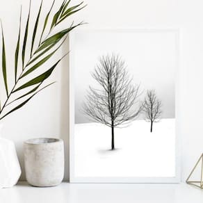 Especificações técnicas: - Título: Quadro Decorativo Árvores Na Neve 24X18Cm - Medidas: 24x18cm A5 - Material da moldura: Madeira branca - Material do papel: Papel fotográfico brilhante de altíssima resolução - Acabamento: Película de acetato para proteção da imagem - Embalagem: Plástico bolha com camada dupla - Fixação: Penduradores inclusos martelo e prego - Limpeza: Pano seco ou espanador