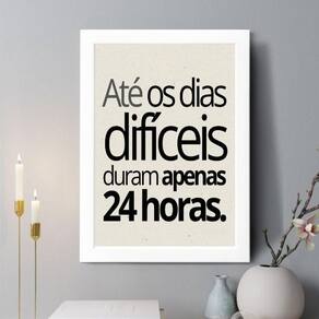 Quadro decorativo até os dias difíceis duram apenas 24h 33x24cm Cor: moldura branca Informações do produto tire todas as suas dúvidas no descritivo abaixo: decoração para quarto, sala, cozinha, escritório, área gourmet e muito mais. Chega de paredes vazias medidas - cada peça tem 33x24cm a4 . Material do papel - papel fotográfico brilhante de altíssima resolução acabamento - todos os quadros são acompanhados de uma película de acetato para proteção da imagem. - os quadros são embalados de forma segura com plástico bolha com camada dupla de acordo com o tamanho dos quadros. - de 3 meses. Meu quadro chegou. Como posso fixá-lo Você precisa apenas de um martelo e um prego, pois os quadros já vão acompanhados de penduradores. Esta é a forma mais indicada. Caso prefira, você pode utilizar uma fita dupla face neste caso, sugerimos de alta qualidade para evitar que descole e seu quadro caia . Como posso limpar meu quadro A limpeza é feita como um móvel comum da sua casa. Apenas um pano seco ou espanador são suficientes para tal Marca: Não Informado Ean: 7892752865159
