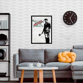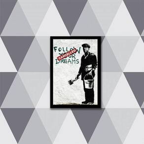 Com o Quadro Decorativo da Quadros On-Line você transforma a decoração do seu ambiente, com beleza e bom gosto. Preencha aquela parede vazia com um quadro de alta qualidade, papel fotográfico brilhante de altíssima resolução e moldura em madeira maciça. Para maior proteção, a peça ainda conta com uma película de acetato. Características: - Papel fotográfico brilhante de altíssima resolução - Película de acetato para proteção da imagem - Moldura em madeira maciça - Pendurador móvel que pode ser retirado facilmente - Pode ser fixado com fita dupla face Especificações técnicas Marca: Quadros On-Line Modelo: Banksy Follow Your Dreams Material: Papel fotográfico brilhante Acabamento: Película de acetato Moldura: Madeira Cor moldura: Preto Tamanho: 45 x 34 cm A3 Fixação: Prego ou fita dupla face de alta qualidade Acompanha pendurador: Sim : 3 meses Dica de limpeza A limpeza é feita como um móvel comum da sua casa. Apenas um pano seco ou espanador são suficientes para tal. Marca: Não Informado Ean: 7892090316979