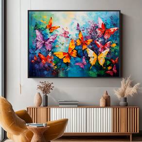 Quadro Decorativo Borboletas Estilo Pintura Moldura Preta e Vidro - 150x100cm -