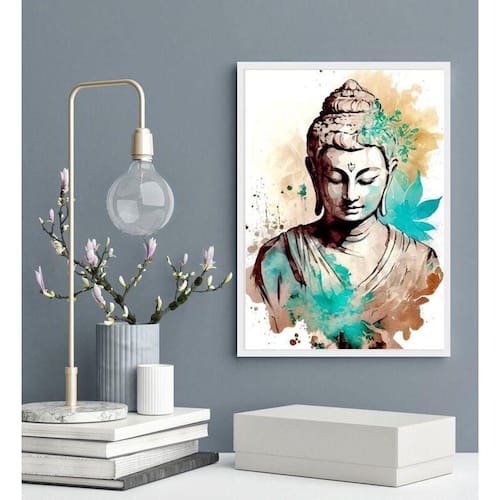 Quadro decorativo buda aquarela turquesa 45x34cm Moldura: madeira branca Informações do produto tire todas as suas dúvidas no descritivo abaixo: decoração para quarto, sala, cozinha, escritório, área gourmet e muito mais. Chega de paredes vazias. Medidas - cada peça tem 45x34cm a3 . Material do papel - papel fotográfico brilhante de altíssima resolução acabamento - todos os quadros são acompanhados de uma película de acetato para proteção da imagem. - os quadros são embalados de forma segura com plástico bolha com camada dupla de acordo com o tamanho dos quadros. Garantia - garantia de 3 meses. Meu quadro chegou. Como posso fixá-lo Você precisa apenas de um martelo e um prego, pois os quadros já vão acompanhados de penduradores. Esta é a forma mais indicada. Caso prefira, você pode utilizar uma fita dupla face neste caso, sugerimos de alta qualidade para evitar que descole e seu quadro caia . Como posso limpar meu quadro A limpeza é feita como um móvel comum da sua casa. Apenas um pano seco ou espanador são suficientes para tal Ean: 7896742059467