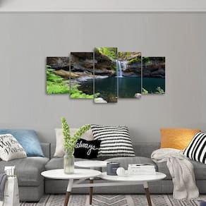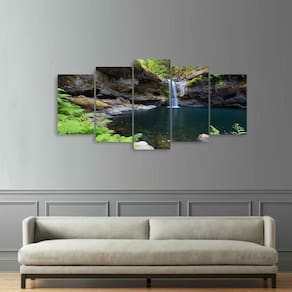 Dimensões do Produto: Quadro decorativo Mosaico de 5 Peças: Tamanho total de 125x60 cm Comprimento x Altura 02 Peças menores de 25x40 cm cada 02 Peças Médias de 25x50 cm cada 01 Peça Central de 25x60 cm. Espaçamento sugerido entre as peças 1 cm Espessura do produto 9 mm