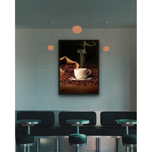 Quadro decorativo café quente saco grãos - 70x50cm Cor: moldura preta Informações do produto tire todas as suas dúvidas no descritivo abaixo: decoração para quarto, sala, cozinha, escritório, área gourmet e muito mais. Chega de paredes vazias medidas - cada peça tem 70x50cm . Material do papel - papel fotográfico brilhante de altíssima resolução acabamento - todos os quadros são acompanhados de vidro para proteção da imagem. - moldura em madeira maciça na cor preta ou branca conforme produto escolhido e pendurador. - os quadros são embalados de forma segura com plástico bolha com camada dupla de acordo com o tamanho dos quadros. - de 3 meses. Meu quadro chegou. Como posso fixá-lo Você precisa apenas de um martelo e um prego, pois os quadros já vão acompanhados de penduradores. Esta é a forma mais indicada. Como posso limpar meu quadro A limpeza é feita como um móvel comum da sua casa. Apenas um pano seco ou espanador são suficientes para tal Marca: Não Informado Ean: 7901039770366