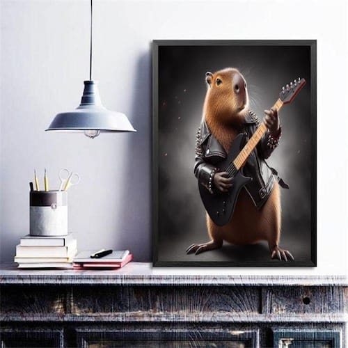 Quadro decorativo capivara do rock 24x18cm Moldura: madeira preta Informações do produto tire todas as suas dúvidas no descritivo abaixo: decoração para quarto, sala, cozinha, escritório, área gourmet e muito mais. Chega de paredes vazias medidas - cada peça tem 24x18cm a5 . Material do papel - papel fotográfico brilhante de altíssima resolução acabamento - todos os quadros são acompanhados de uma película de acetato para proteção da imagem. - os quadros são embalados de forma segura com plástico bolha com camada dupla de acordo com o tamanho dos quadros. Garantia - garantia de 3 meses. Meu quadro chegou. Como posso fixá-lo Você precisa apenas de um martelo e um prego, pois os quadros já vão acompanhados de penduradores. Esta é a forma mais indicada. Caso prefira, você pode utilizar uma fita dupla face neste caso, sugerimos de alta qualidade para evitar que descole e seu quadro caia . Como posso limpar meu quadro A limpeza é feita como um móvel comum da sua casa. Apenas um pano seco ou espanador são suficientes para tal