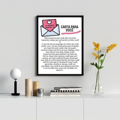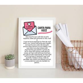 Quadro decorativo carta para você 24x18cm Moldura: madeira preta Informações do produto tire todas as suas dúvidas no descritivo abaixo: decoração para quarto, sala, cozinha, escritório, área gourmet e muito mais. Chega de paredes vazias medidas - cada peça tem 24x18cm a5 . Material do papel - papel fotográfico brilhante de altíssima resolução acabamento - todos os quadros são acompanhados de uma película de acetato para proteção da imagem. - os quadros são embalados de forma segura com plástico bolha com camada dupla de acordo com o tamanho dos quadros. - de 3 meses. Meu quadro chegou. Como posso fixá-lo Você precisa apenas de um martelo e um prego, pois os quadros já vão acompanhados de penduradores. Esta é a forma mais indicada. Caso prefira, você pode utilizar uma fita dupla face neste caso, sugerimos de alta qualidade para evitar que descole e seu quadro caia . Como posso limpar meu quadro A limpeza é feita como um móvel comum da sua casa. Apenas um pano seco ou espanador são suficientes para tal Marca: Não Informado Ean: 7899398530816