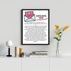Quadro decorativo carta para você 45x34cm Moldura: madeira preta Informações do produto tire todas as suas dúvidas no descritivo abaixo: decoração para quarto, sala, cozinha, escritório, área gourmet e muito mais. Chega de paredes vazias. Medidas - cada peça tem 45x34cm a3 . Material do papel - papel fotográfico brilhante de altíssima resolução acabamento - todos os quadros são acompanhados de uma película de acetato para proteção da imagem. - os quadros são embalados de forma segura com plástico bolha com camada dupla de acordo com o tamanho dos quadros. Garantia - garantia de 3 meses. Meu quadro chegou. Como posso fixá-lo Você precisa apenas de um martelo e um prego, pois os quadros já vão acompanhados de penduradores. Esta é a forma mais indicada. Caso prefira, você pode utilizar uma fita dupla face neste caso, sugerimos de alta qualidade para evitar que descole e seu quadro caia . Como posso limpar meu quadro A limpeza é feita como um móvel comum da sua casa. Apenas um pano seco ou espanador são suficientes para tal Ean: 7890003687277