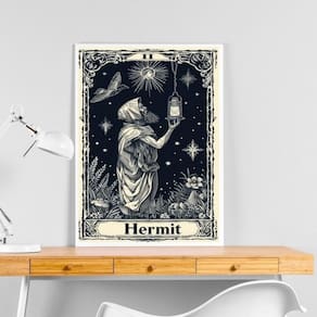 Quadro decorativo carta tarot - eremita 24x18cm - com vidro Cor: moldura branca Informações do produto tire todas as suas dúvidas no descritivo abaixo: decoração para quarto, sala, cozinha, escritório, área gourmet e muito mais. Chega de paredes vazias medidas - cada peça tem 24x18cm a5 . Material do papel - papel fotográfico brilhante de altíssima resolução acabamento - todos os quadros são acompanhados de vidro para proteção da imagem. - moldura em madeira maciça na cor preta ou branca conforme produto escolhido e pendurador . - os quadros são embalados de forma segura com plástico bolha com camada dupla de acordo com o tamanho dos quadros. Garantia - garantia de 3 meses. Meu quadro chegou. Como posso fixá-lo Você precisa apenas de um martelo e um prego, pois os quadros já vão acompanhados de penduradores. Esta é a forma mais indicada. Como posso limpar meu quadro A limpeza é feita como um móvel comum da sua casa. Apenas um pano seco ou espanador são suficientes para tal Ean: 7891234560384