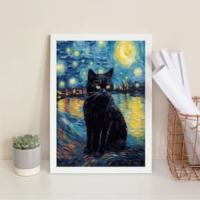 Quadro decorativo cat night starry art 33x24cm - com vidro Moldura: madeira branca Informações do produto tire todas as suas dúvidas no descritivo abaixo: decoração para quarto, sala, cozinha, escritório, área gourmet e muito mais. Chega de paredes vazias medidas - cada peça tem 33x24cm a4 . Material do papel - papel fotográfico brilhante de altíssima resolução acabamento - todos os quadros são acompanhados de vidro para proteção da imagem. - moldura em madeira maciça na cor preta ou branca conforme produto escolhido e pendurador . - os quadros são embalados de forma segura com plástico bolha com camada dupla de acordo com o tamanho dos quadros. Garantia - garantia de 3 meses. Meu quadro chegou. Como posso fixá-lo Você precisa apenas de um martelo e um prego, pois os quadros já vão acompanhados de penduradores. Esta é a forma mais indicada. Como posso limpar meu quadro A limpeza é feita como um móvel comum da sua casa. Apenas um pano seco ou espanador são suficientes para tal Ean: 7891037424982