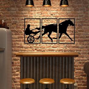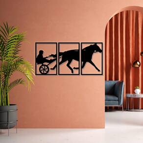 Especificações Técnicas: Medidas: comprimento: 38 cm altura: 3mm largura: 57 cm Material: mdf 3mm Cor: preto Tema: cavalo Formas de instalação: basta utilizar fitas dupla face Quantidade: 3 unidades Características específicas: São 3 quadros medindo 38×57 cada um. Medida total 114x57 cm