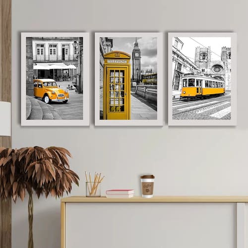 Descrição do produto: O Quadro Decorativo City London Yellow traz a elegância da cidade de Londres com um destaque moderno em amarelo vibrante. Composto por 3 peças de 33x25 cm cada, o conjunto é protegido por vidro, garantindo durabilidade e fácil limpeza. Ideal para salas, escritórios ou ambientes contemporâneos, ele adiciona personalidade e sofisticação à decoração. Benefícios: Alta durabilidade: Moldura resistente e vidro protetor que preserva a arte contra poeira, umidade e pequenos impactos. Design que impressiona:Com cores marcantes e composição moderna, este quadro transforma qualquer parede em um ponto de destaque, elevando o estilo do seu ambiente com personalidade e sofisticação. Praticidade total: Acompanha suporte para pendurar, pronto para decorar semcomplicações. Características:03 Peça(s)Com vidro.Moldura feita de madeira maciça disponíveis nas cores:Preta, Branca, Rosa e Azul TurquesaImagem A4 de alta qualidade protegida contra umidade. Dimensões por peça:Moldura: 25 cm L. 33,7 cm AlturaImagem: 21 cm L. 30 cm AlturaVidro: 0,3 mm Espessura. Marca: Estação Vest