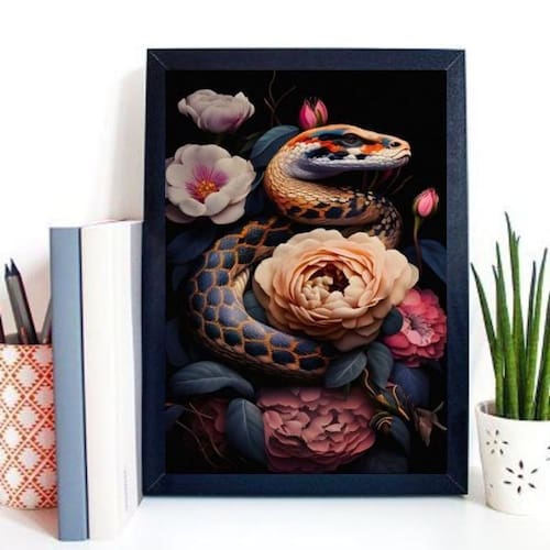 Quadro decorativo cobra com flores 45x34cm Moldura: madeira preta Informações do produto tire todas as suas dúvidas no descritivo abaixo: decoração para quarto, sala, cozinha, escritório, área gourmet e muito mais. Chega de paredes vazias. Medidas - cada peça tem 45x34cm a3 . Material do papel - papel fotográfico brilhante de altíssima resolução acabamento - todos os quadros são acompanhados de uma película de acetato para proteção da imagem. - os quadros são embalados de forma segura com plástico bolha com camada dupla de acordo com o tamanho dos quadros. Garantia - garantia de 3 meses. Meu quadro chegou. Como posso fixá-lo Você precisa apenas de um martelo e um prego, pois os quadros já vão acompanhados de penduradores. Esta é a forma mais indicada. Caso prefira, você pode utilizar uma fita dupla face neste caso, sugerimos de alta qualidade para evitar que descole e seu quadro caia . Como posso limpar meu quadro A limpeza é feita como um móvel comum da sua casa. Apenas um pano seco ou espanador são suficientes para tal