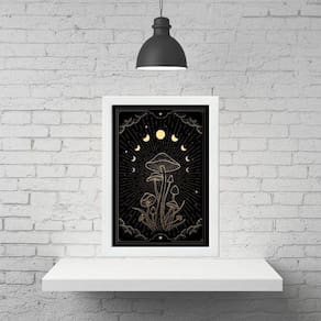 Quadro decorativo cogumelos fases da lua 33x24cm Moldura: madeira preta Informações do produto tire todas as suas dúvidas no descritivo abaixo: decoração para quarto, sala, cozinha, escritório, área gourmet e muito mais. Chega de paredes vazias medidas - cada peça tem 33x24cm a4 . Material do papel - papel fotográfico brilhante de altíssima resolução acabamento - todos os quadros são acompanhados de uma película de acetato para proteção da imagem. - os quadros são embalados de forma segura com plástico bolha com camada dupla de acordo com o tamanho dos quadros. Garantia - garantia de 3 meses. Meu quadro chegou. Como posso fixá-lo Você precisa apenas de um martelo e um prego, pois os quadros já vão acompanhados de penduradores. Esta é a forma mais indicada. Caso prefira, você pode utilizar uma fita dupla face neste caso, sugerimos de alta qualidade para evitar que descole e seu quadro caia . Como posso limpar meu quadro A limpeza é feita como um móvel comum da sua casa. Apenas um pano seco ou espanador são suficientes para tal