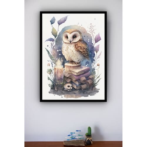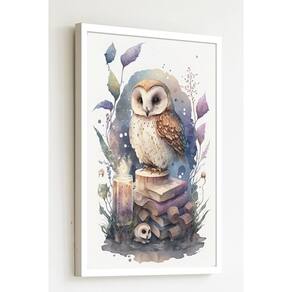 Quadro Decorativo Coruja Alquimista Aquarela - 70x50cm - Cor: Moldura Branca