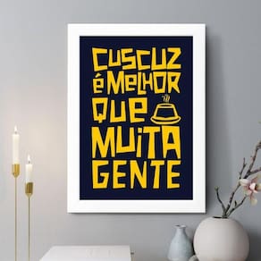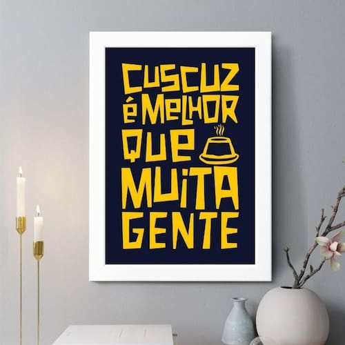 Quadro decorativo cuscuz é melhor que muita gente 45x34cm - com vidro Cor: moldura branca Informações do produto tire todas as suas dúvidas no descritivo abaixo: decoração para quarto, sala, cozinha, escritório, área gourmet e muito mais. Chega de paredes vazias medidas - cada peça tem 45x34cm a3 . Material do papel - papel fotográfico brilhante de altíssima resolução acabamento - todos os quadros são acompanhados de vidro para proteção da imagem. - moldura em madeira maciça na cor preta ou branca conforme produto escolhido e pendurador . - os quadros são embalados de forma segura com plástico bolha com camada dupla de acordo com o tamanho dos quadros. Garantia - garantia de 3 meses. Meu quadro chegou. Como posso fixá-lo Você precisa apenas de um martelo e um prego, pois os quadros já vão acompanhados de penduradores. Esta é a forma mais indicada. Como posso limpar meu quadro A limpeza é feita como um móvel comum da sua casa. Apenas um pano seco ou espanador são suficientes para tal