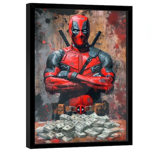 Quadro Decorativo Deadpool Money Moldura Preta e Vidro - 84x54cm -