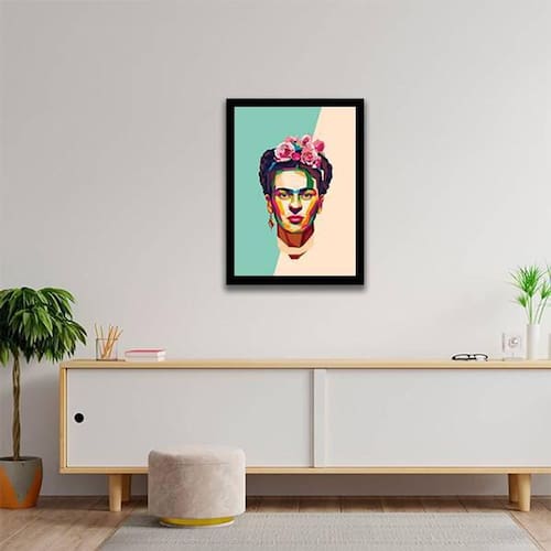 Quadro decorativo decorativo frida geométrico Tamanho: a4 20 x 30 Acabamento: película de acetato Moldura: madeira preta Informações do produto