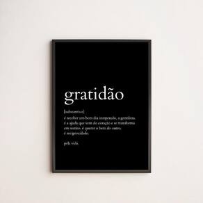 Quadro decorativo definição de gratidão 33x24cm - com vidro Moldura: madeira preta Informações do produto tire todas as suas dúvidas no descritivo abaixo: decoração para quarto, sala, cozinha, escritório, área gourmet e muito mais. Chega de paredes vazias medidas - cada peça tem 33x24cm a4 . Material do papel - papel fotográfico brilhante de altíssima resolução acabamento - todos os quadros são acompanhados de vidro para proteção da imagem. - moldura em madeira maciça na cor preta e pendurador . - os quadros são embalados de forma segura com plástico bolha com camada dupla de acordo com o tamanho dos quadros. Garantia - garantia de 3 meses. Meu quadro chegou. Como posso fixá-lo Você precisa apenas de um martelo e um prego, pois os quadros já vão acompanhados de penduradores. Esta é a forma mais indicada. Como posso limpar meu quadro A limpeza é feita como um móvel comum da sua casa. Apenas um pano seco ou espanador são suficientes para tal Ean: 7895142246606